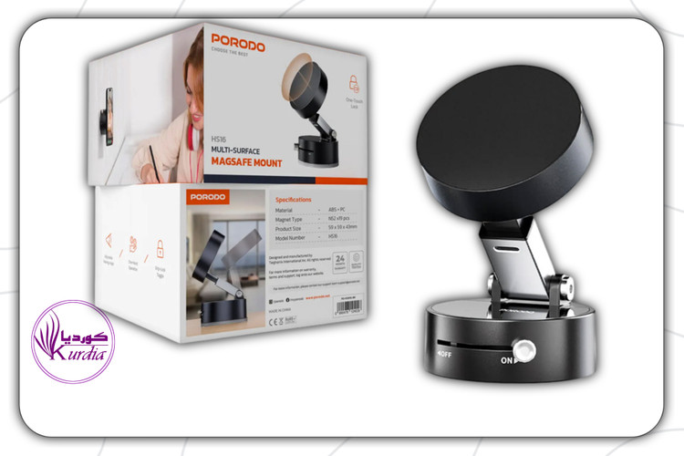 Porodo Multi-Surface MagSafe Mount مشکی یک راه حل منحصر به فرد و ایمن برای هر پایه دستگاه تلفن همراه است. این پایه که با مواد ABS + PC ساخته شده است، با 19 آهنربا N52 تعبیه شده است که نگهداری قوی و پایدار را فراهم میکند. قفل تک لمسی به شما امکان می دهد دستگاه خود را در چند ثانیه نصب کنید. کلید Grip-Lock پایه را محکم می کند تا دستگاه شما را هنگام استفاده در مکان های مختلف از جا کنده نکند. این ترکیبی از کاربرد و طراحی سطحی زیبا برای اتومبیل ها، میزها یا سطوح صاف است.