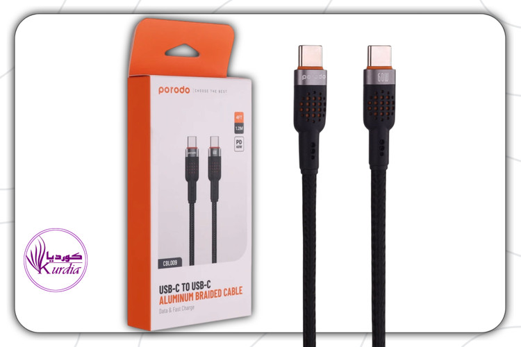 کابل 1.2 متری آلومینیومی Type-C به Type-C 60W پرودو مدل Porodo USB-C to USB-C Aluminum Braided Cable PD-CBL0009-BK