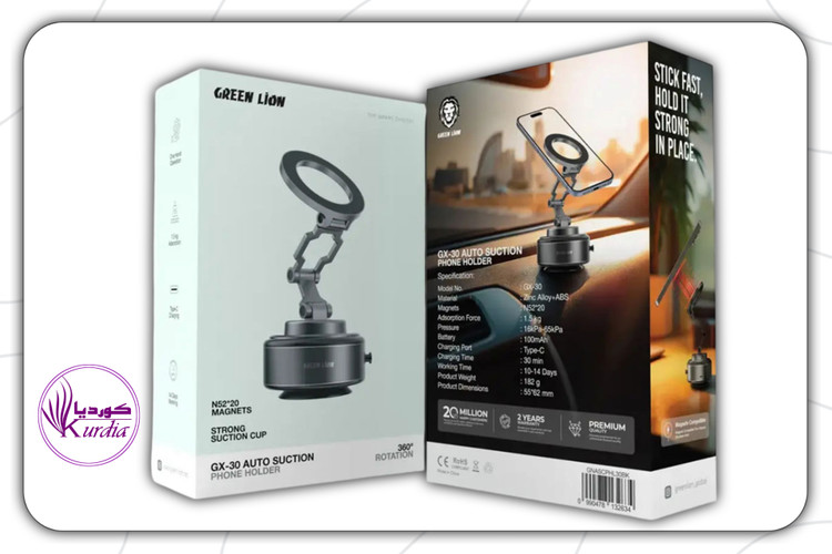 نگهدارنده تلفن مکش خودکار Green Lion GX-30 – مشکی مات یک پایه ماشین مغناطیسی ممتاز است که از آلیاژ روی سنگین و ABS ساخته شده است و دارای آهنرباهای قوی N52*20 با نیروی جذب 1.5 کیلوگرمی برای گرفتن محکم گوشی شما است. مکش خودکار آن با فشار 16kPa – 65kPa برای افزایش پایداری در سطوح مختلف ارائه می شود. کار با یک دست، نصب و جدا کردن را آسان می کند. باتری 100 میلی آمپر ساعتی که از شارژ نوع C پشتیبانی می کند و شارژ فوق سریع 30 دقیقه ای را برای 10 تا 14 روز استفاده فراهم می کند. برای رانندگی بدون هندز، تماس و تجربه رانندگی دلپذیر ایده آل است.